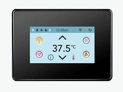 Color Touch Screen Controls. This easy-to-use control panel features a large multilingual color LCD interface with intuitive icons and animations. There are no buttons to press, just touch the feature you want to control on the touch sensitive screen. The outside ring of the topside lights up and glows the same color as the lights in your Spa. Easily program filtration cycles and set your temperature. Multiple speed pump, jet control and with available stereo option, full control over your music streaming to your Spa via Bluetooth. Your control panel will also warn you of any issues. If the Hot Tub is too hot or the heater is not getting enough water, your control panel will alert you immediately.